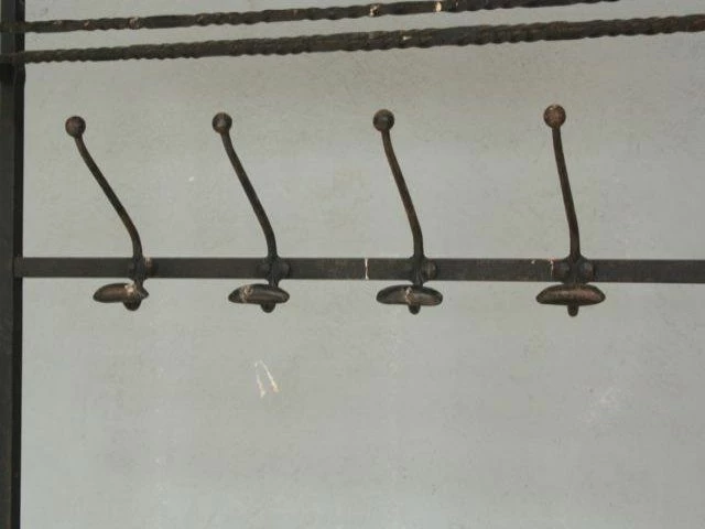 wrought iron coat rack 1900 with 4 twisted fr bar hooks.